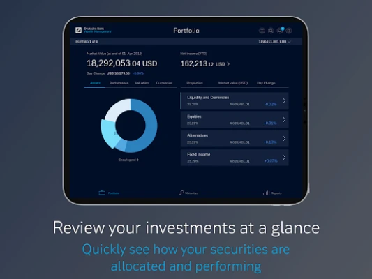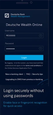 Deutsche Wealth Online LUX is the online banking service for clients of Deutsche Bank Wealth Management Luxembourg. Enjoy functionalities and benefits such as: • Portfolio and dashboard overview: Get a detailed overview of your portfolios which includes asset class allocation, currency holdings, valuation and performance along with additional details on holdings, maturities and transactions • Reports and downloads: View your account statements and all other bank documents available in DWO • Charts for visualization: Evaluate, comprehend and act on data faster and more effectively with various charts which include historical values • E-credentials: Receive a new temporary password or pin at your email address registered with the Bank in case you forgot your credentials or your account is locked