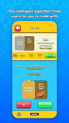 • Swipe to Exchange: Find trade partners quickly by swiping right to accept or left to decline trade proposals. No more tedious searching for trades.