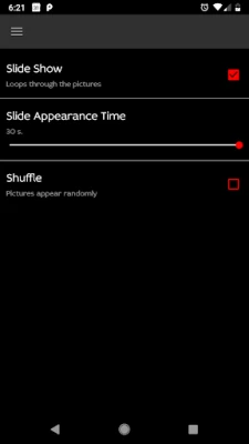 The application has an easy and intuitive layout. Changing images is done by simple swiping gesture. It is also possible to set up a slide show, where images can be shuffled and displayed for a desired time.