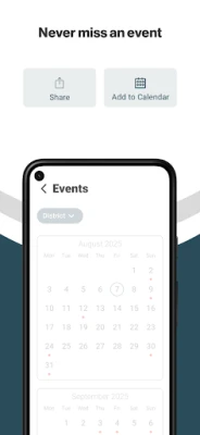 NEVER MISS AN EVENT The event section shows a list of events throughout the district. Users can add an event to their calendar and share the event with friends and family with one tap.